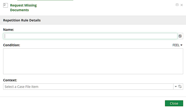 A number of plan item attributes indicated by graphical markers or "decorators" imply the attribute is set when the marker is present, but technically the attribute is set only when its associated rule is true. In the rule definition dialogs, only the rule Name and Condition are used. Condition is a Boolean FEEL expression of case file items. Currently Case Modeler ignores the Context field.