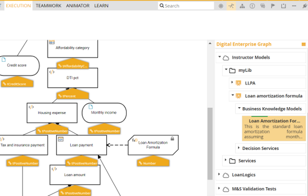 A BKM is linked to its invoking decision or BKM by a dashed arrow called a knowledge requirement. The invoking element passes values to each of the BKM’s parameters and receives in return the output of the BKM’s value expression. The image below illustrates invocation of the BKM Loan Amortization Formula by the decision Loan payment.