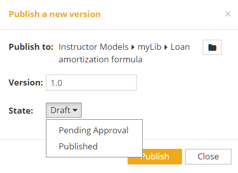Collaborating teams of modelers can keep track of their work by managing versions of the model. The Publish action on the Teamwork ribbon lets you create a new version and set its State to either Draft, Pending Approval, or Published.