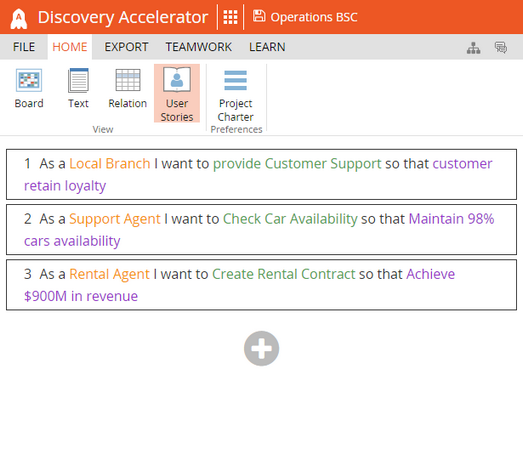 The "User Stories" view allows for an easy way to conduct business discovery. With this view, you can fill out simple forms to define the type of user, what they want and why in order to create your business discovery. From this view you will be able to order and decompose your user stories.