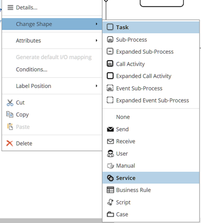 Several basic activity types are represented by distinct shapes in the Shapes panel. In general, however, any activity type may be converted to another type using the Change Shape context menu.
