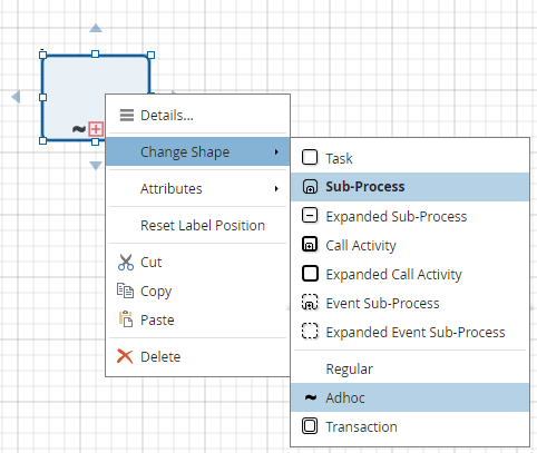 To define a subprocess as a transaction, apply the Change Shape context menu action. A transaction subprocess is indicated in the diagram by a double border.