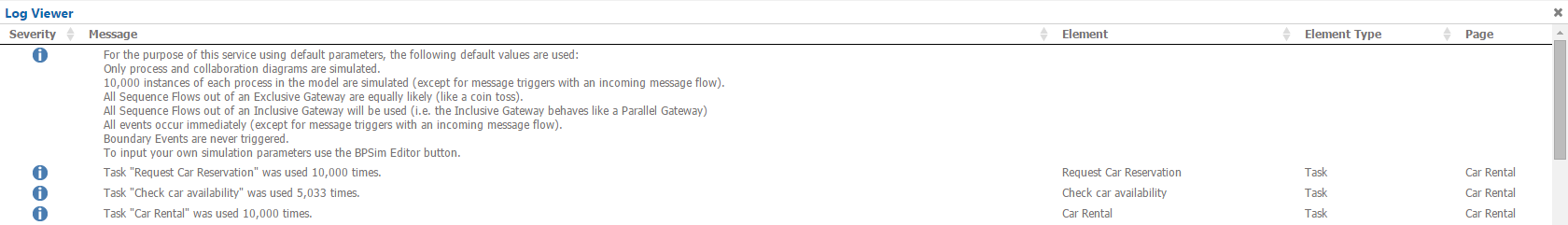 The Simulate action then runs the simulation based on your parameters. A simulation log will appear on the bottom of the screen with the results of your simulation. Clicking on an element in the log viewer will select the corresponding shape in the diagram.