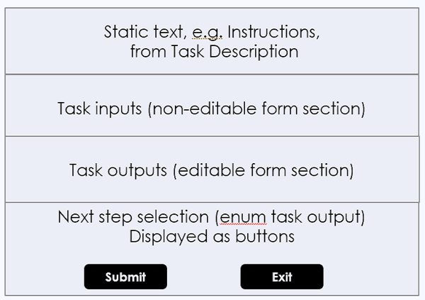 At the top you may provide some static text, defined in the task Description field from the element Details. Below that is a non-editable form section displaying the task inputs. The order of the information displayed is the order of the task inputs. Below that is an editable form section displaying the task outputs. If the last task output has enumerated values, each value is displayed as a button, which assigns that value to the output. This can be tested by a gateway following the task to direct the process to the next step.